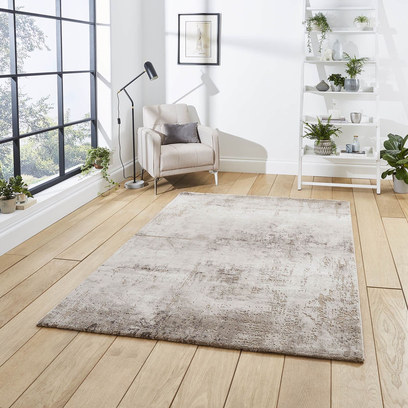 The Florence Modern Soft Metallic Distressed Rug in Beige/Silver, measuring 120x170 cm. This exquisite rug features a stunning metallic effect that gives it a unique, distressed appearance, adding a touch of rustic charm to any modern living room. The soft yarn used in its construction provides a plush and comfortable texture underfoot, making it perfect for lounging and relaxing. Crafted from high-quality polypropylene material, this rug is highly durable and easy to maintain. It can withstand heavy foot traffic and can be easily cleaned with a vacuum or mild soap and water. The contemporary design of this rug makes it an ideal choice for modern interiors, complementing a variety of decor styles. The Florence Modern Soft Metallic Distressed Rug in Beige/Silver is the perfect addition to any home, creating a warm and inviting ambiance while adding a touch of character to the room. Its unique distressed design is sure to impress your guests and become a conversation starter. Whether you're looking to create a cozy reading nook or add some personality to your living room, this rug is an excellent choice.