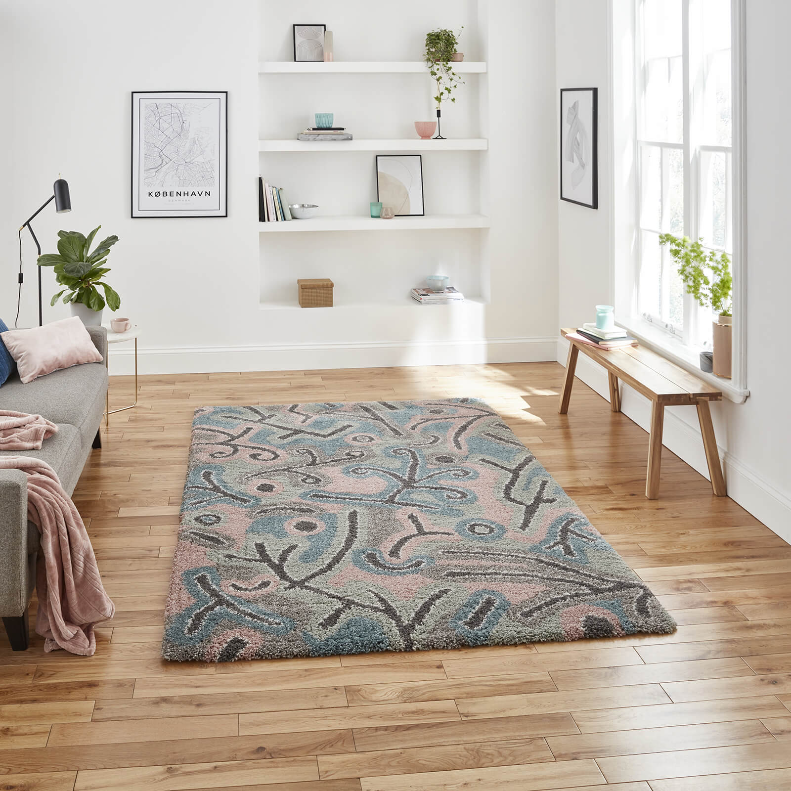 The design of the rug you choose is of course entirely up to you. We offer everything from plains to Handcarved florals, shaggy warmth to hardwearing polypropylene and durable flatweave designs. It is worth considering other pattern and colour within the room’s decor before you make your selection. If your pictures or textiles are busy, a neutrally- patterned or block coloured rug will sit better among them. For rooms that are minimalistic in look, or plainer and more pared back in their design details, texture, pattern and a mixed palette can add interest.